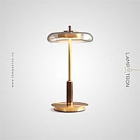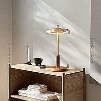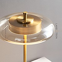LED table light with glass disc-shaped diffuser on a rack made of brass and wood