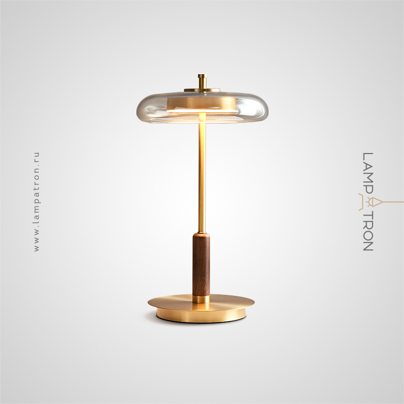 LED table light with glass disc-shaped diffuser on a rack made of brass and wood