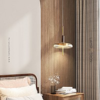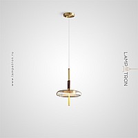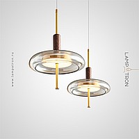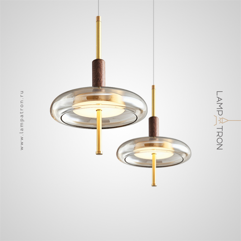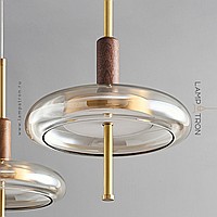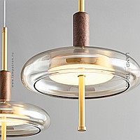 Pendant LED luminaire with glass disc-shaped diffuser on brass and wood leg