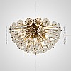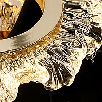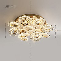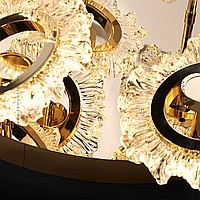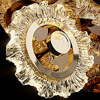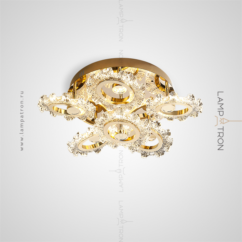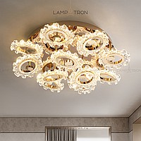 A series of ceiling chandeliers with a peregon with a ring luminous core on vertical racks.