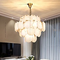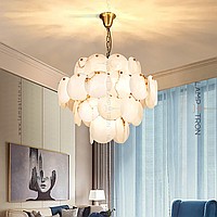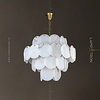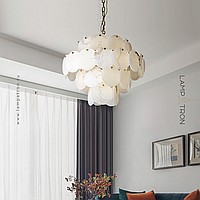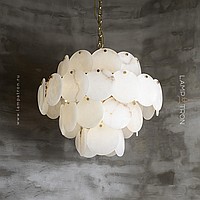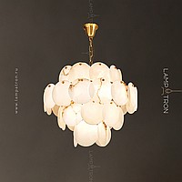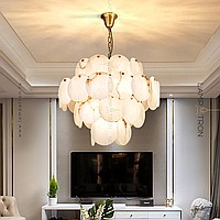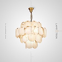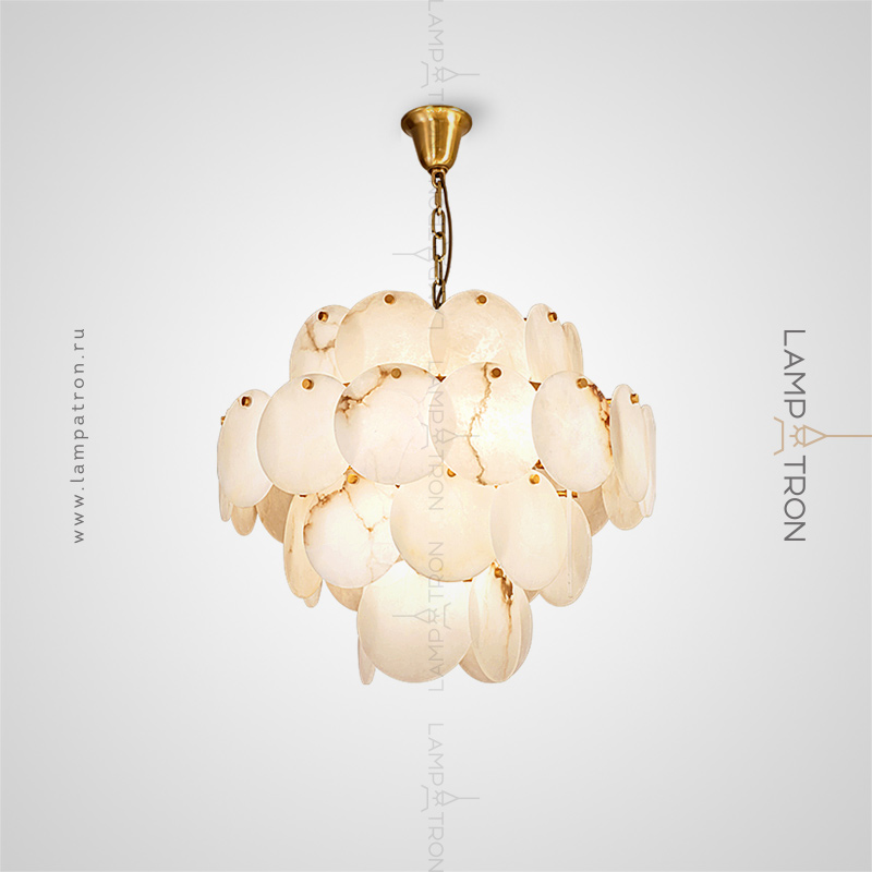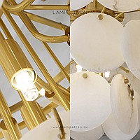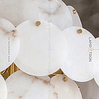 Designer chandelier with a multi -level lampshade of round pendants of noble Spanish marble