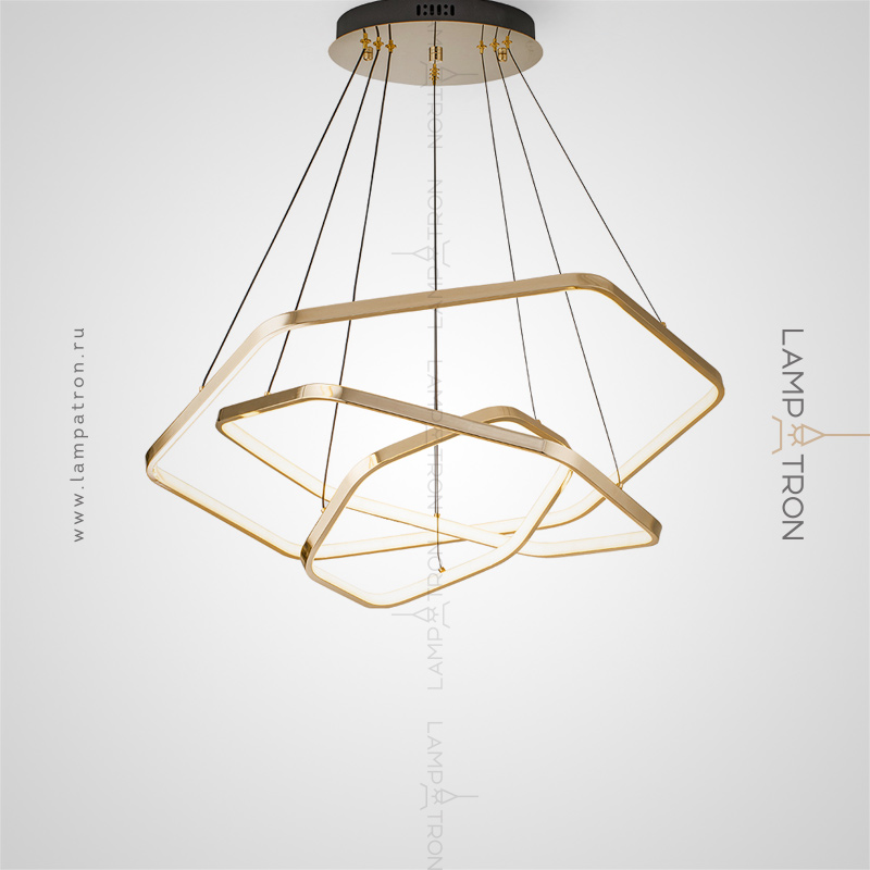 A trial-tier chandelier with lamps in the form of polygons with an internal LED-browing along the contour