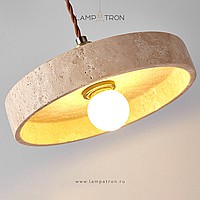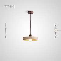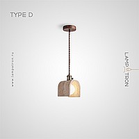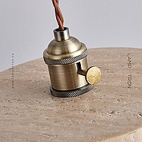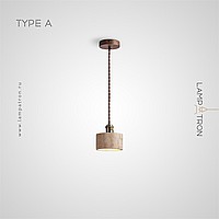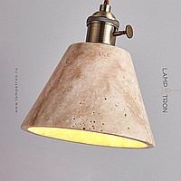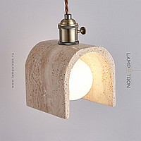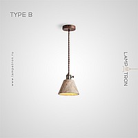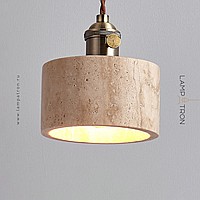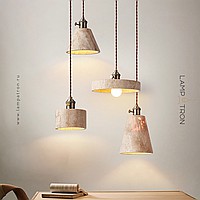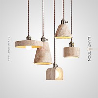 A series of pendant lamps with a geometric stone body and wooden fastening