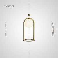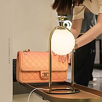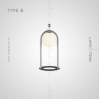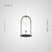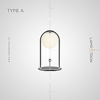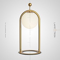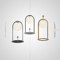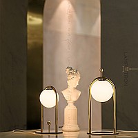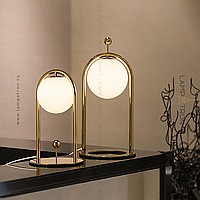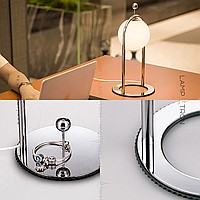 A series of desktop lamps with spherical matte plafins inside a metal frame and a button for color temperature regulation on the cord