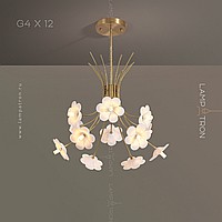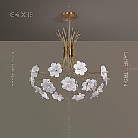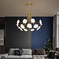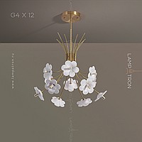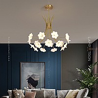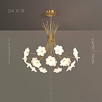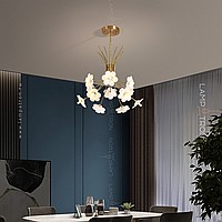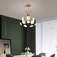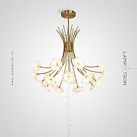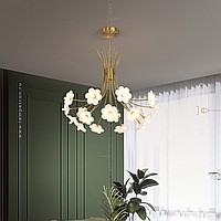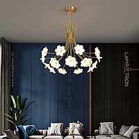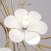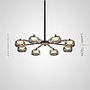 A series of designer chandeliers in the form of a bunch of curved oxes with white ceiling patches