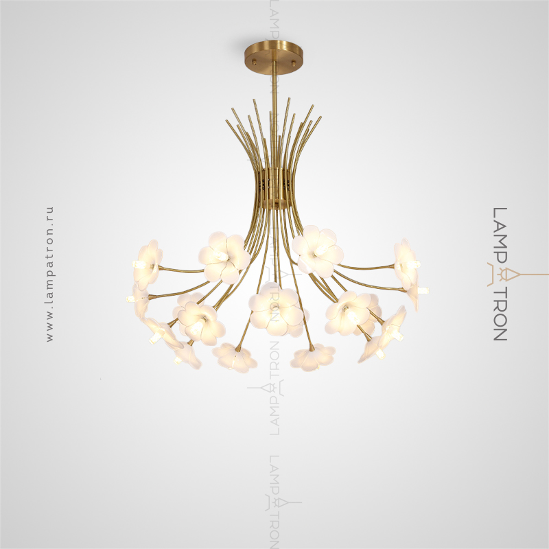 A series of designer chandeliers in the form of a bunch of curved oxes with white ceiling patches