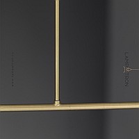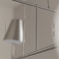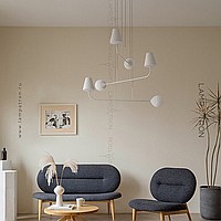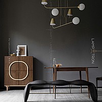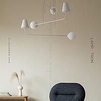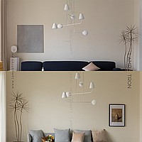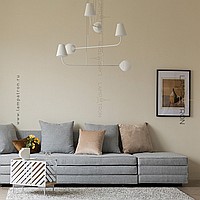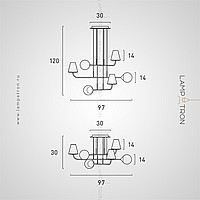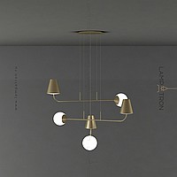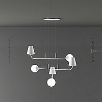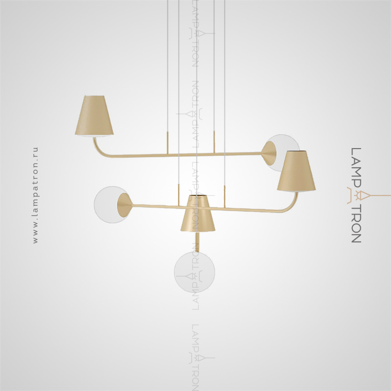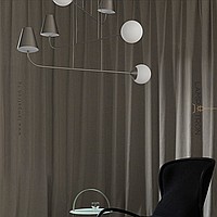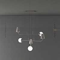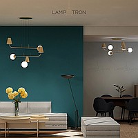 A series of multi -level chandeliers with spherical and conical shades on curved horizontal rails