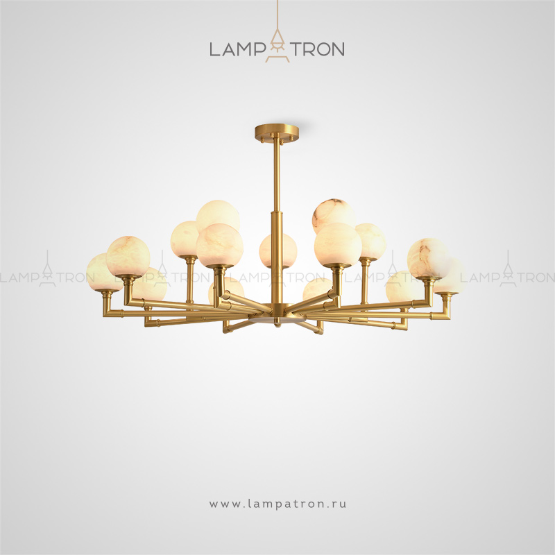 A series of chandeliers with spherical lamps of natural marble on the radial frame