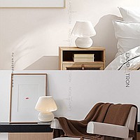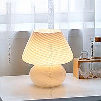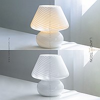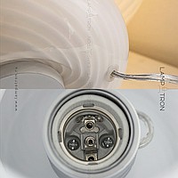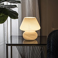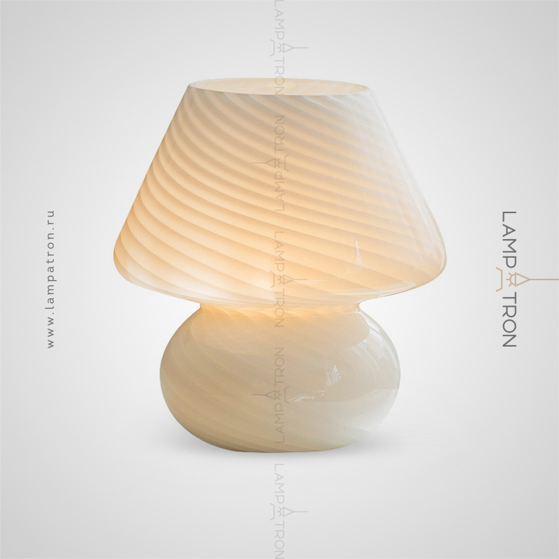 A whole glass table with a rounded base and a conical lampshade with a spiral pattern