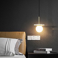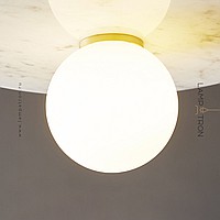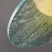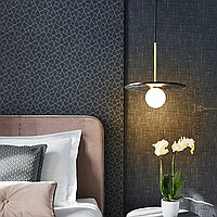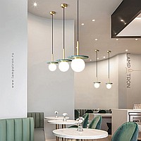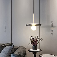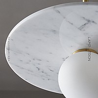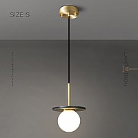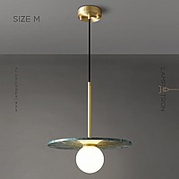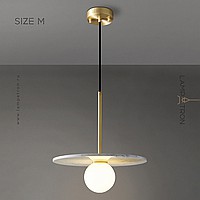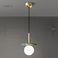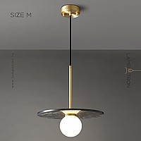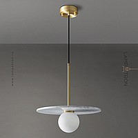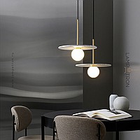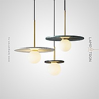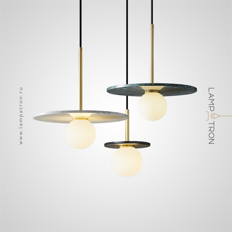 A series of pendant lamps with a glass spherical shade and a marble diffuser in the shape of a disc