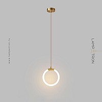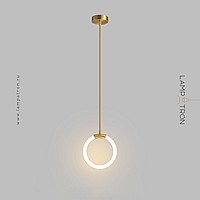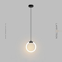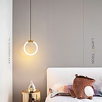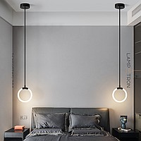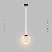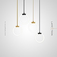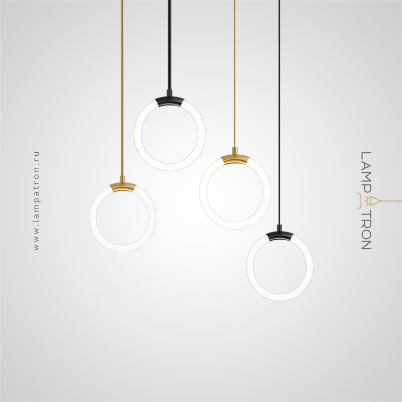 A series of LED luminaires in the form of a luminous ring on a rack and a pendant cable