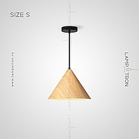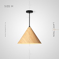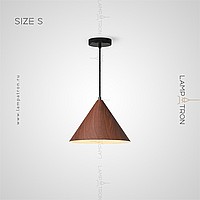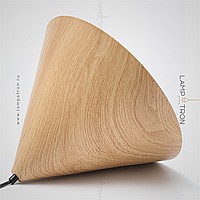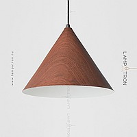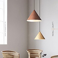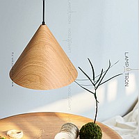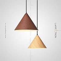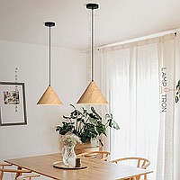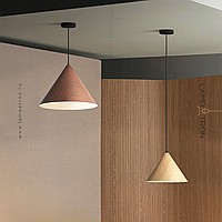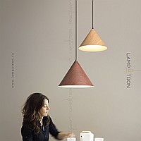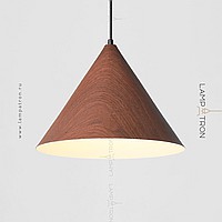 A series of suspended lamps with conical -shaped lacquers under a dark and light tree
