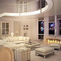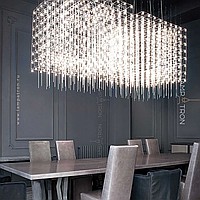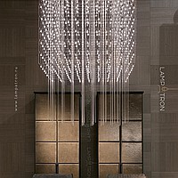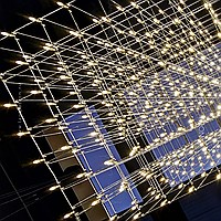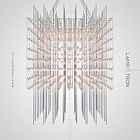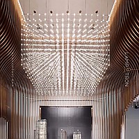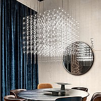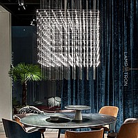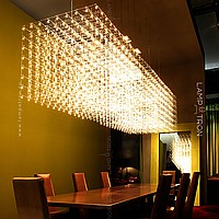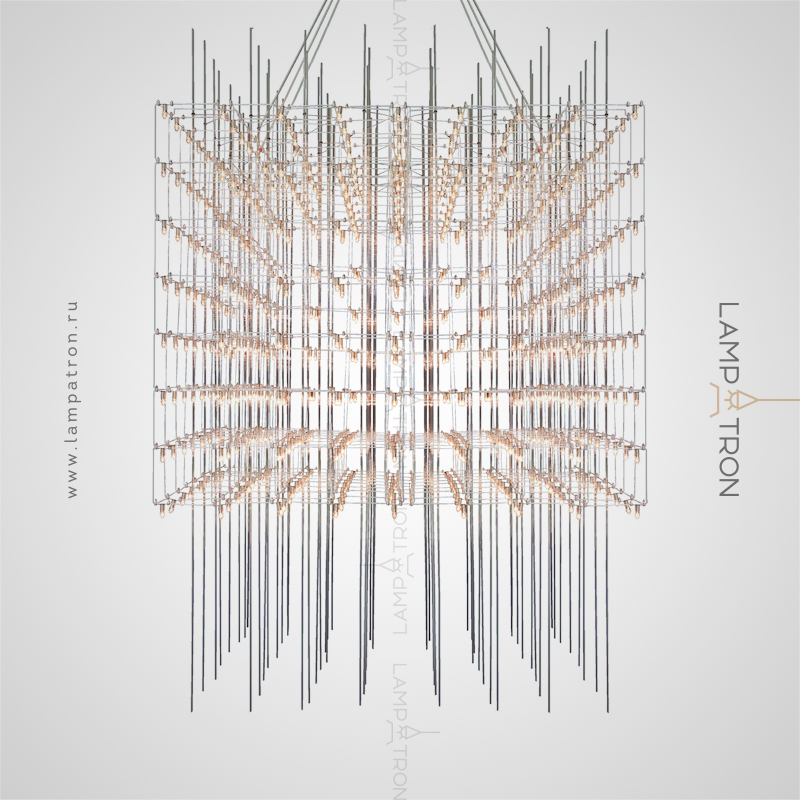Designer LED chandelier with multiple point lights on a cube-shaped lattice frame