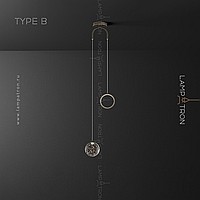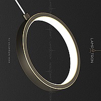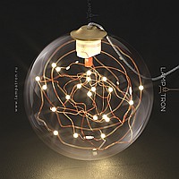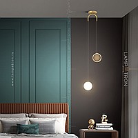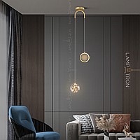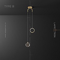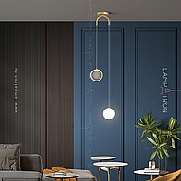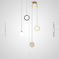 A series of suspended lamps in the form of a combination of a luminous ring and a spherical ceiling made of white and transparent glass with a garland