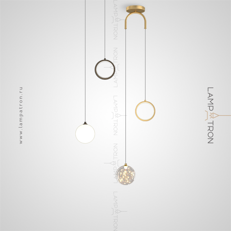 A series of suspended lamps in the form of a combination of a luminous ring and a spherical ceiling made of white and transparent glass with a garland
