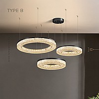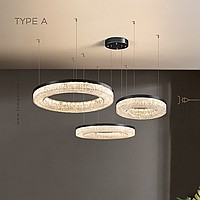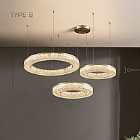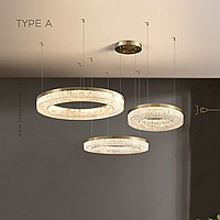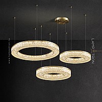 A series of LED chandeliers in the form of a combination of rings of different diameters with a translucent diffuser with an ice effect