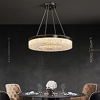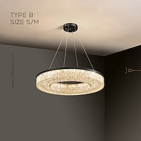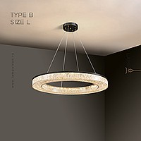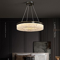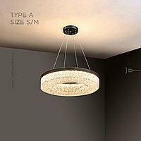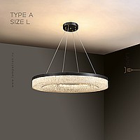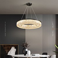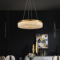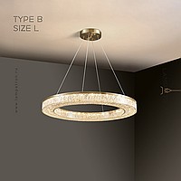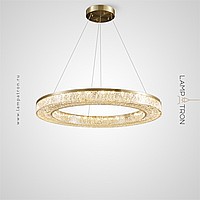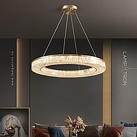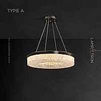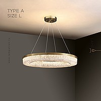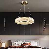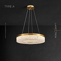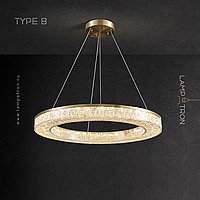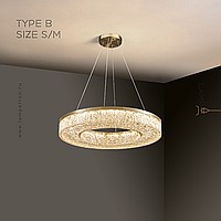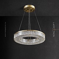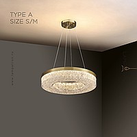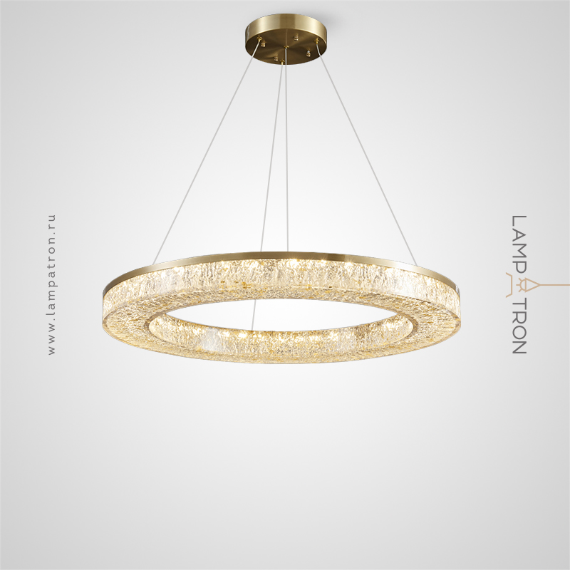 A series of LED chandeliers with a translucent diffuser with an ice effect on a brass ring case