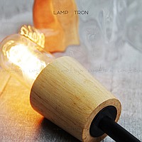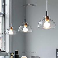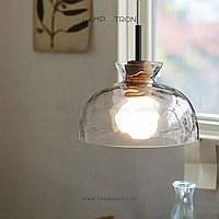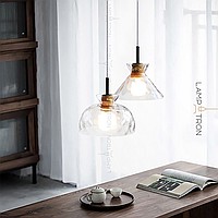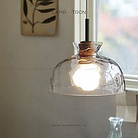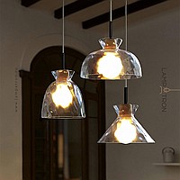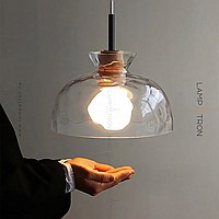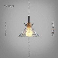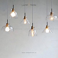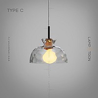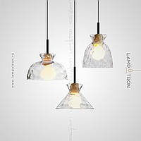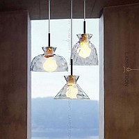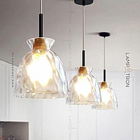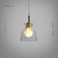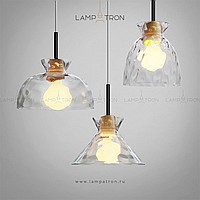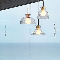 A series of suspended lamps with embossed ceilings of various shapes of blowing glass with wooden base