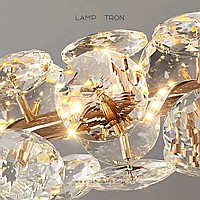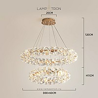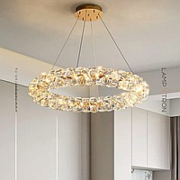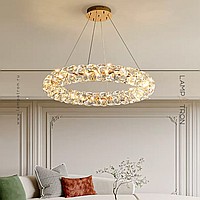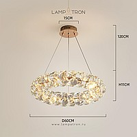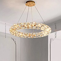 A series of designer chandeliers with an internal LED glow on a ring frame and round glass diffusers