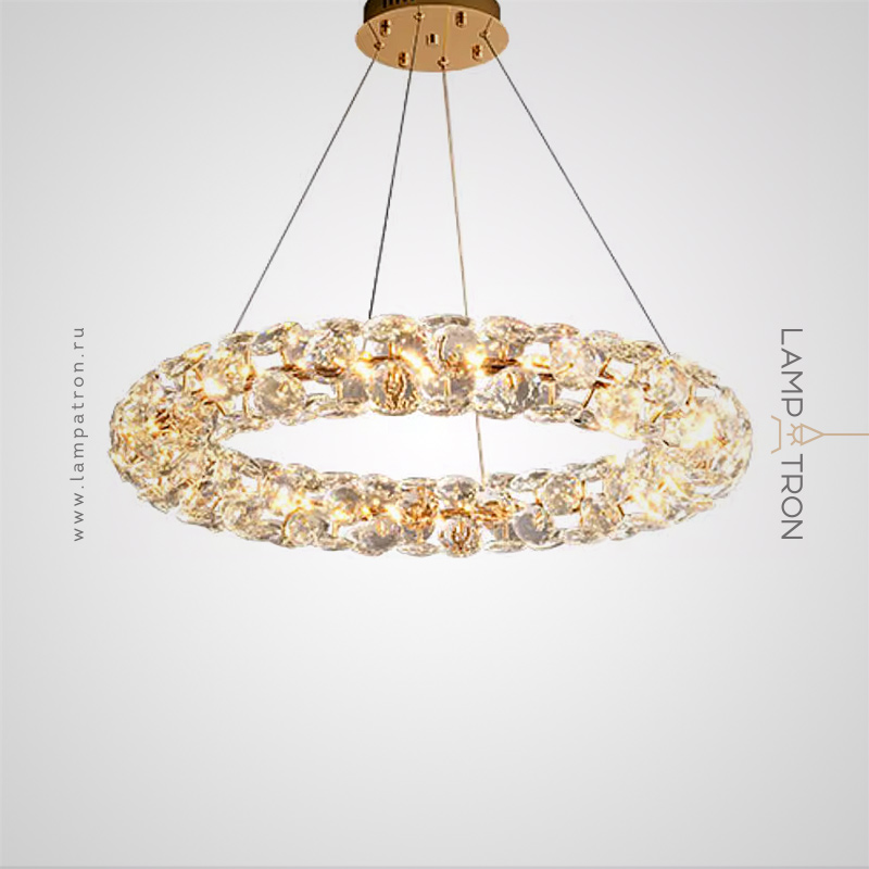 A series of designer chandeliers with an internal LED glow on a ring frame and round glass diffusers