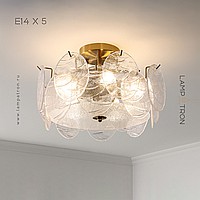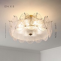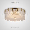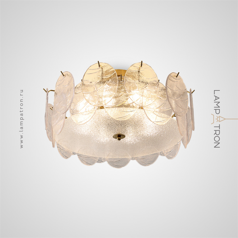 A series of ceiling chandeliers with disc-shaped diffusers made of embossed glass