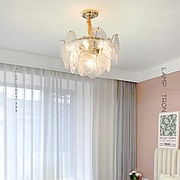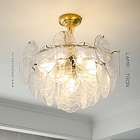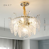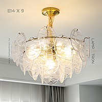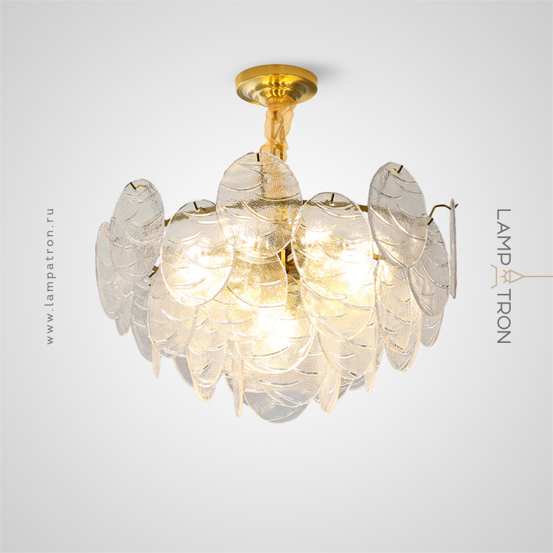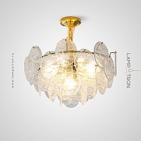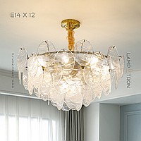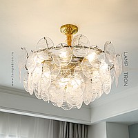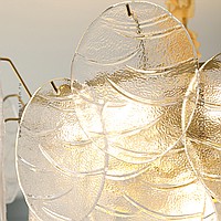 A series of cascading chandeliers with disc-shaped diffusers made of embossed glass