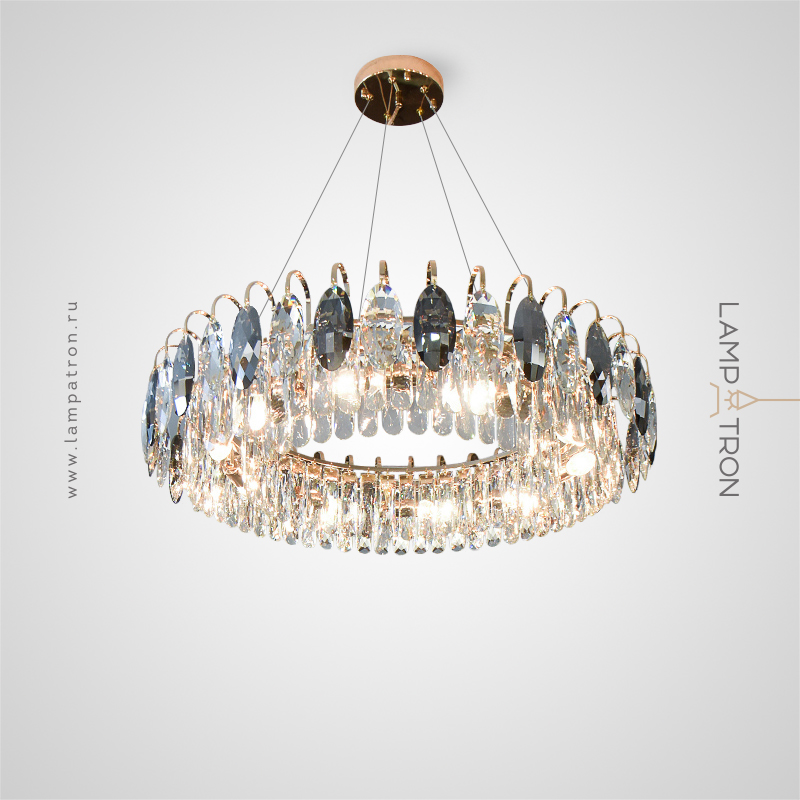 A series of ring chandeliers with almond-shaped diffusers made of transparent and smoky crystal K9