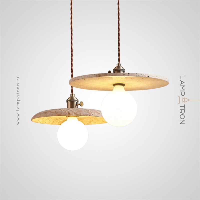 A series of pendant lamps with a disc-shaped lampshade made of yellow travertine stone