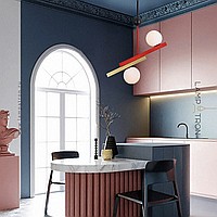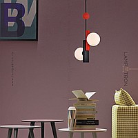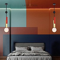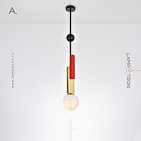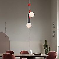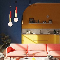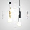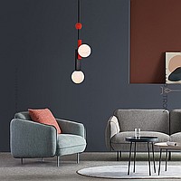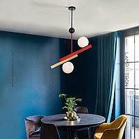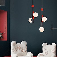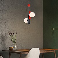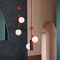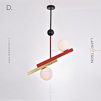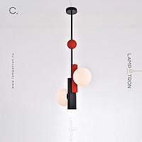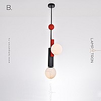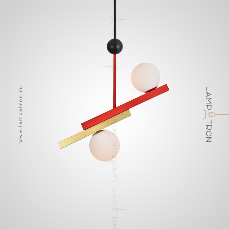 A series of suspended lamps in the form of combinations of rectangular and spherical elements