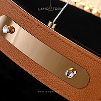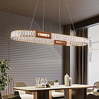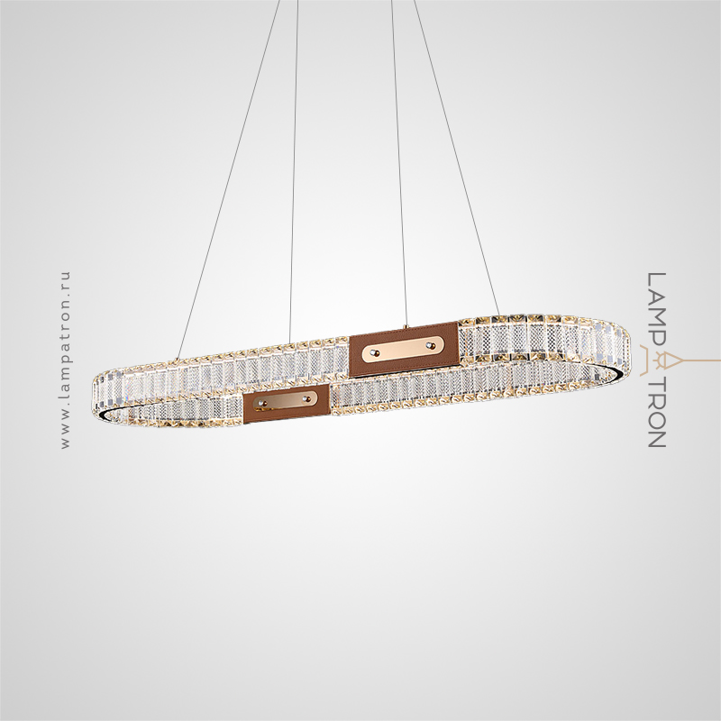 Slatted LED luminaire with crystal diffusers on a looped housing with leather trim