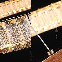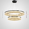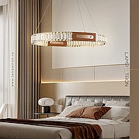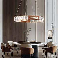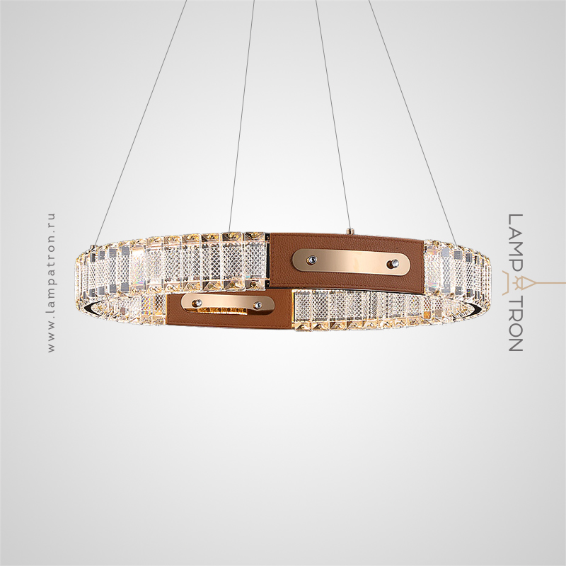A series of ring LED chandeliers with embossed crystal diffusers and genuine leather trim