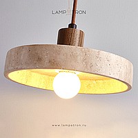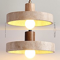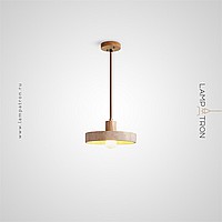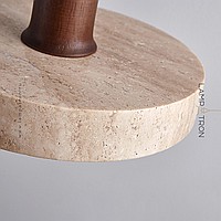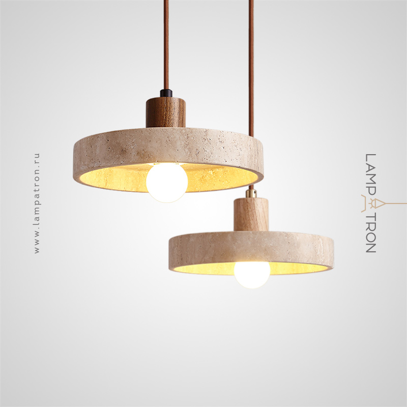 A series of pendant lamps with a disc-shaped lampshade made of travertine stone and a wooden plinth