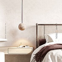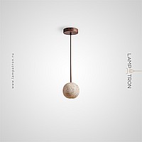 Pendant lamp with spherical body made of yellow travertine stone and dark wood mount