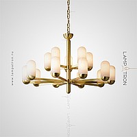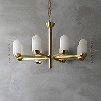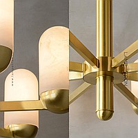 A series of designer chandeliers on a radial frame with elongated rounded plafones made of natural white marble