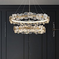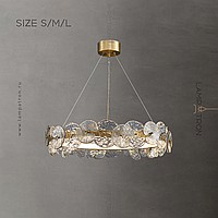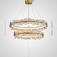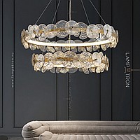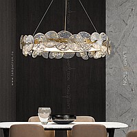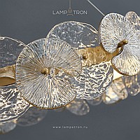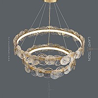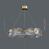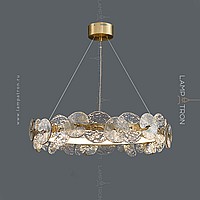 A series of designer chandeliers with an internal LED-brow on a ring frame and round-shaped glass dialivors