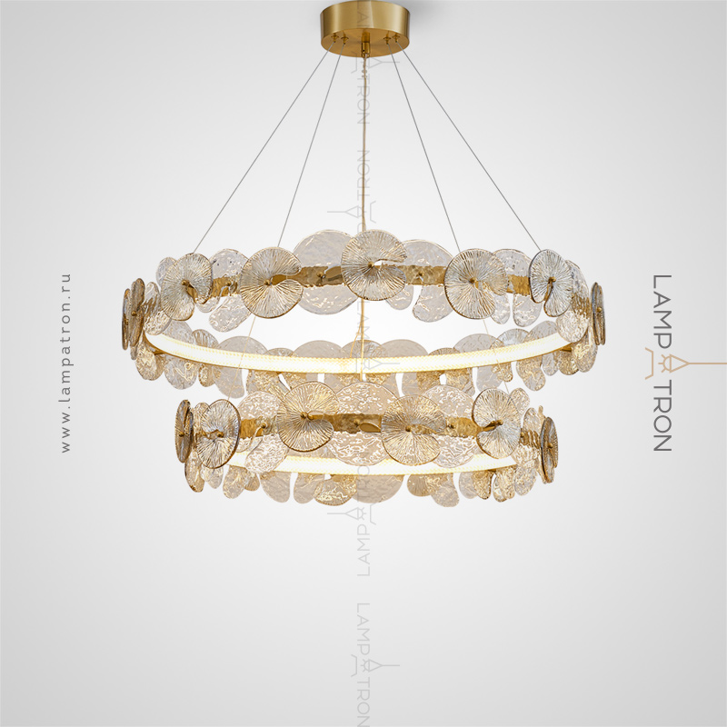 A series of designer chandeliers with an internal LED-brow on a ring frame and round-shaped glass dialivors