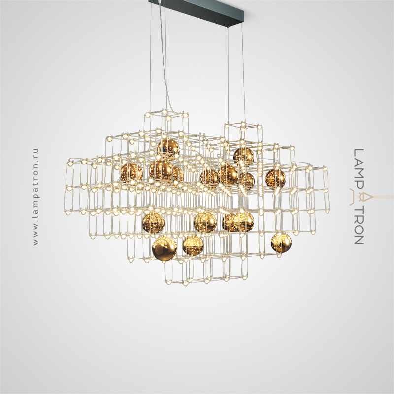 Designer chandelier with point springs and decorative balls on a lattice frame