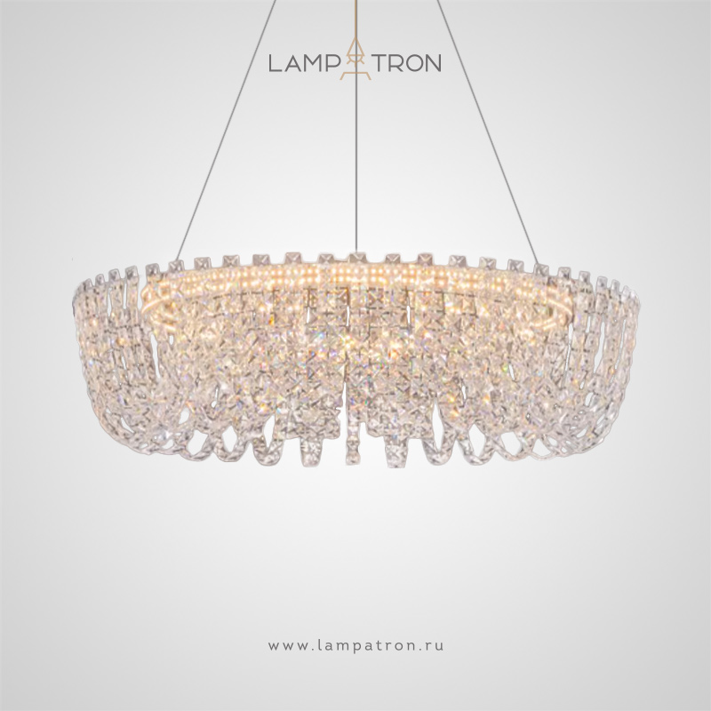 A series of designer chandeliers with décor made of pendants made of square crystal plates