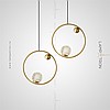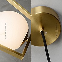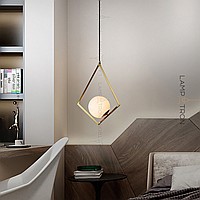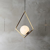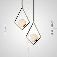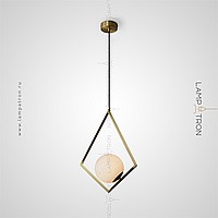 Suspended lamp with a spherical marble ceiling inside a metal frame in the shape of a rhombus