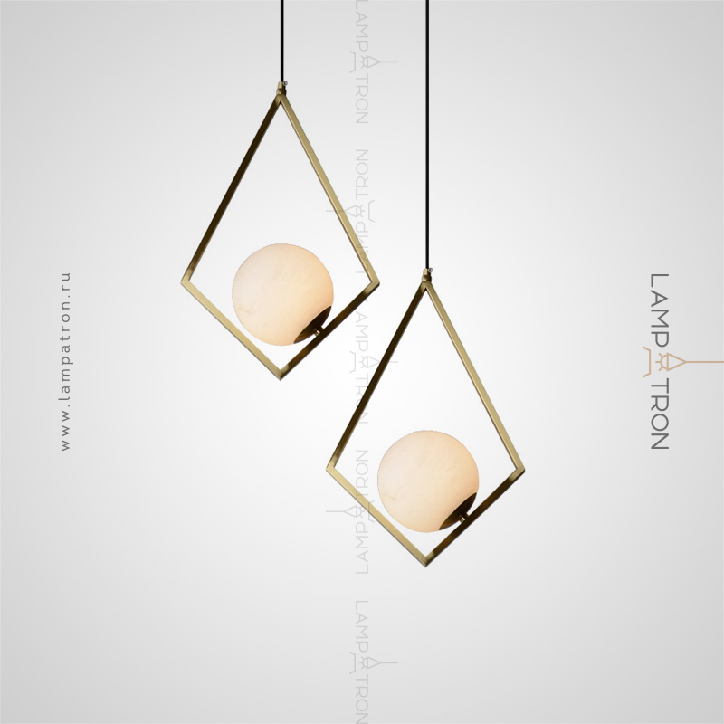 Suspended lamp with a spherical marble ceiling inside a metal frame in the shape of a rhombus