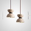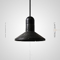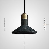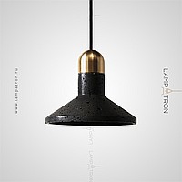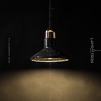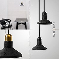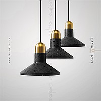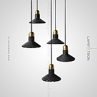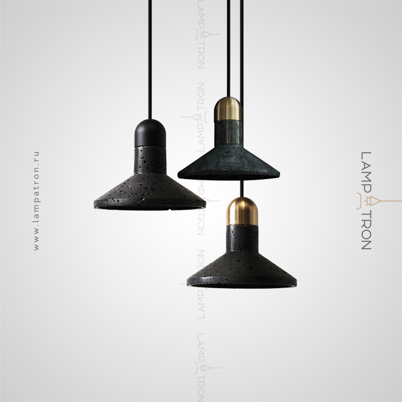 A series of suspended lamps with cone -shaped plafones of lava stone and green marble