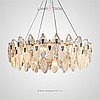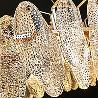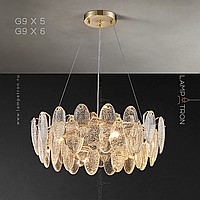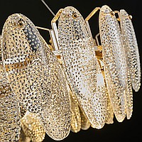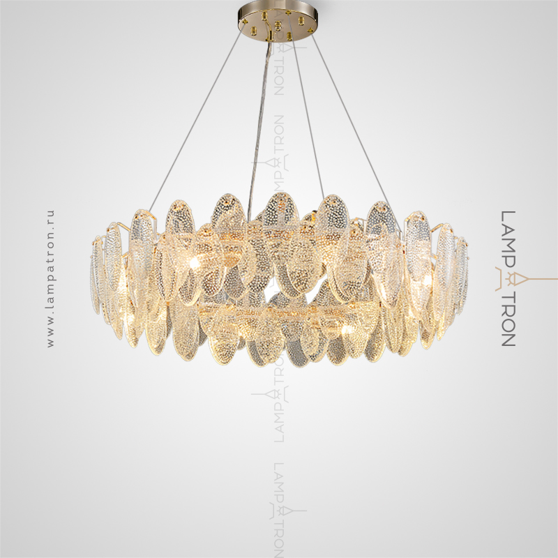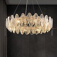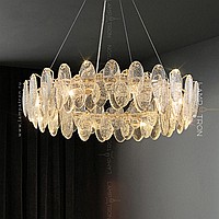 A series of circular designer chandeliers with relief crystal distorters of an elliptical shape