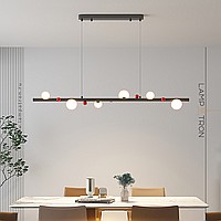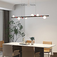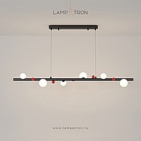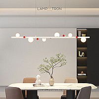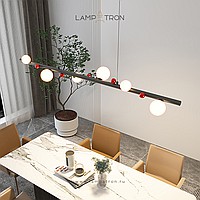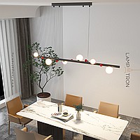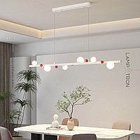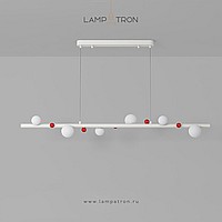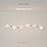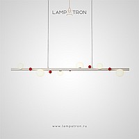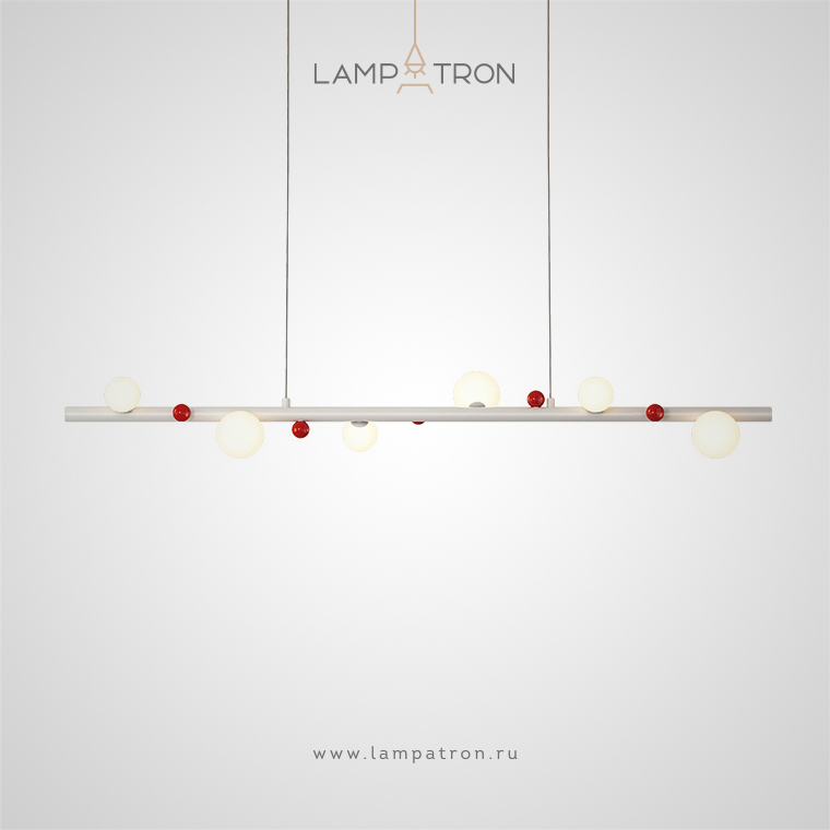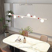 Pendant row lamp with alternating white spherical shades and decorative red balls