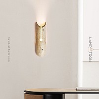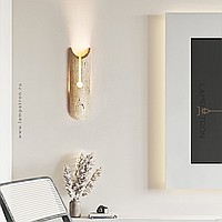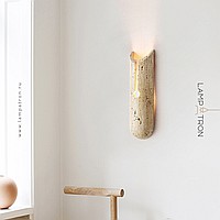 Wall-mounted LED luminaire with figured body with rounded edges made of yellow travertine stone