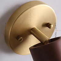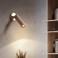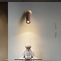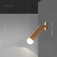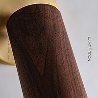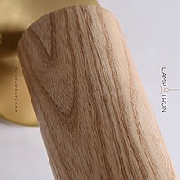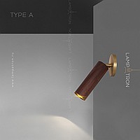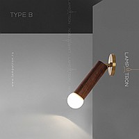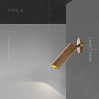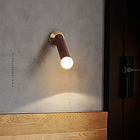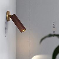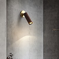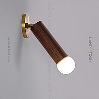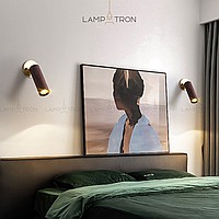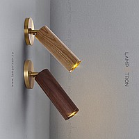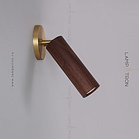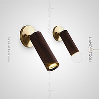A series of wall lamps with a swivel cylindrical shade made of dark and light wood