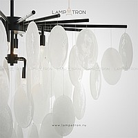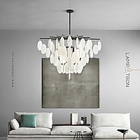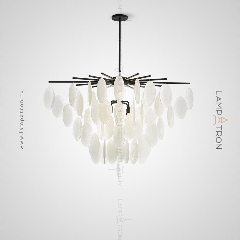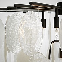 A series of chandeliers with a cascading lampshade made of round pendants made of embossed glass