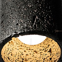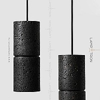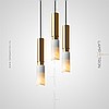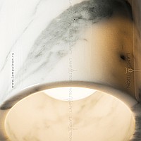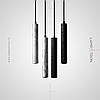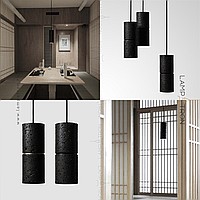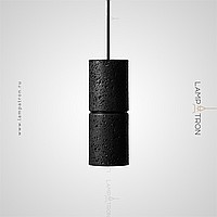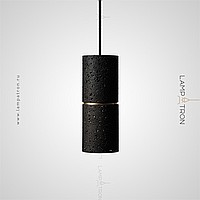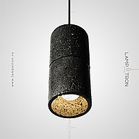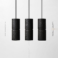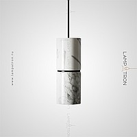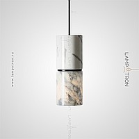 A series of suspended lamps with segmented cylindrical patches of white marble and black stone