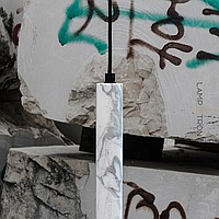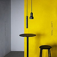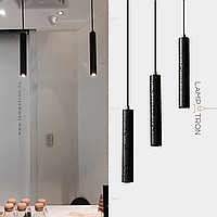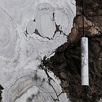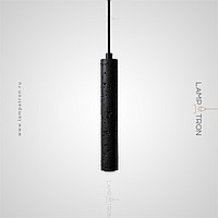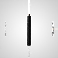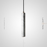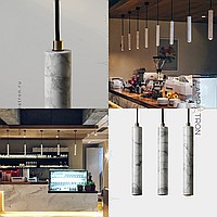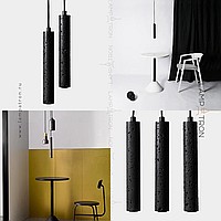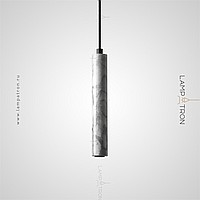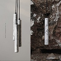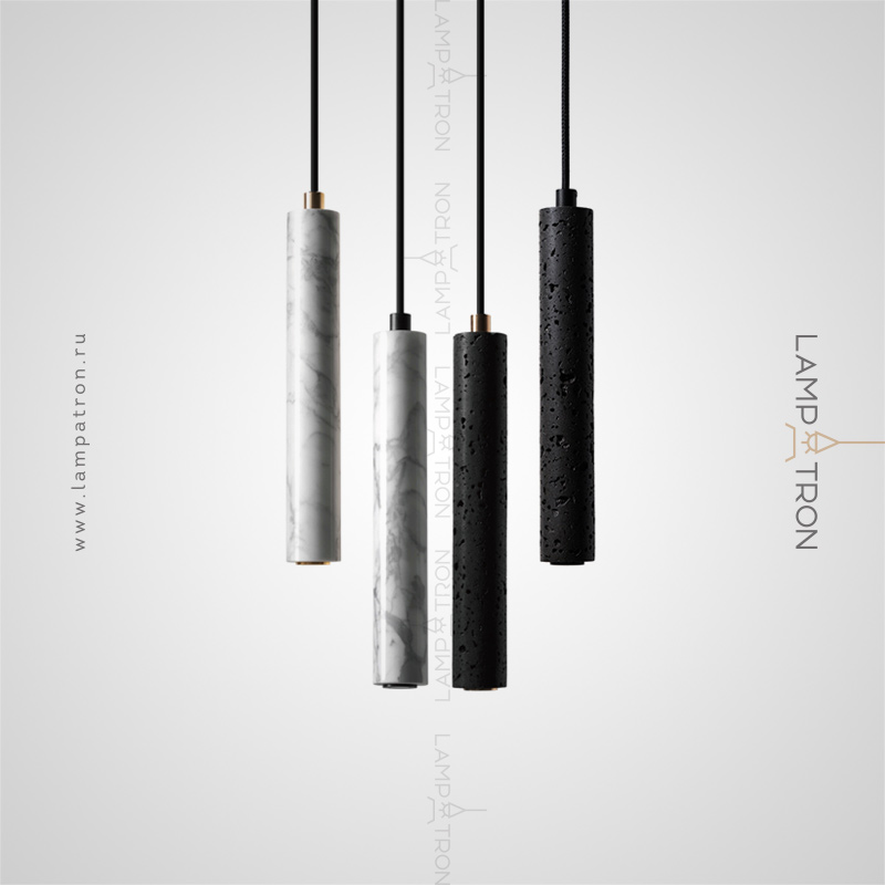 A series of suspended lamps with elongated cylindrical patches of white marble and black stone