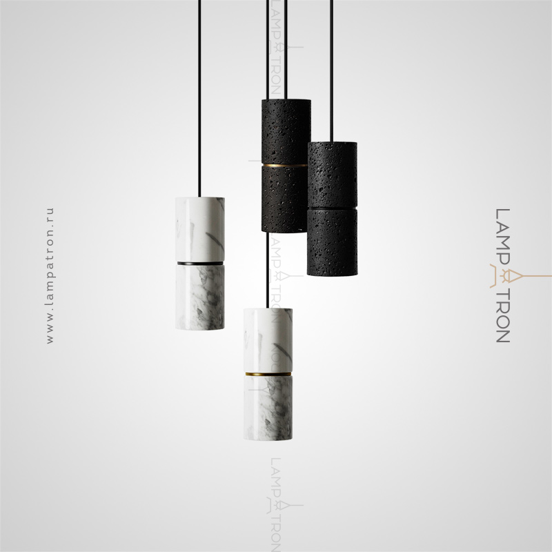 A series of suspended lamps with segmented cylindrical patches of white marble and black stone