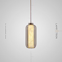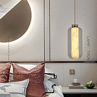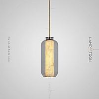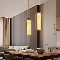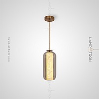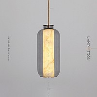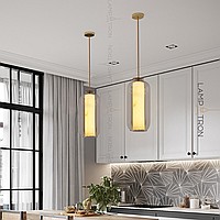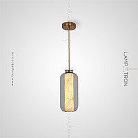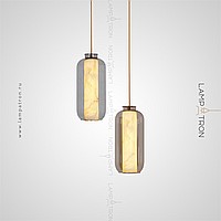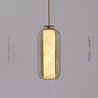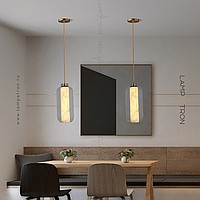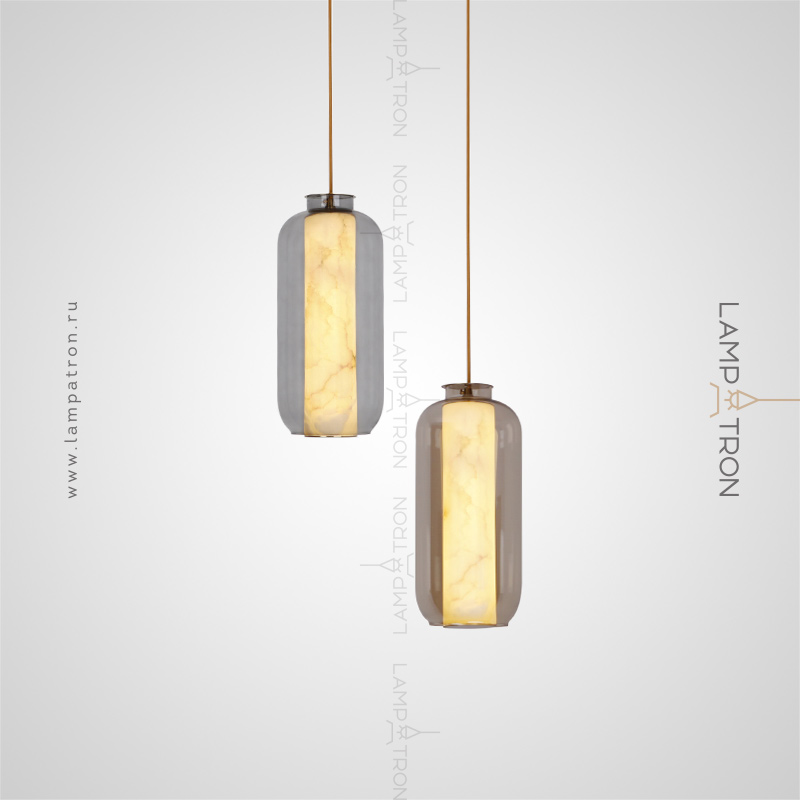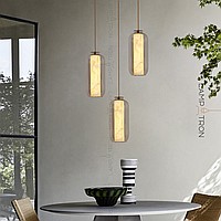 A series of suspended LED lamps with cylindrical marble peregons in glass flasks